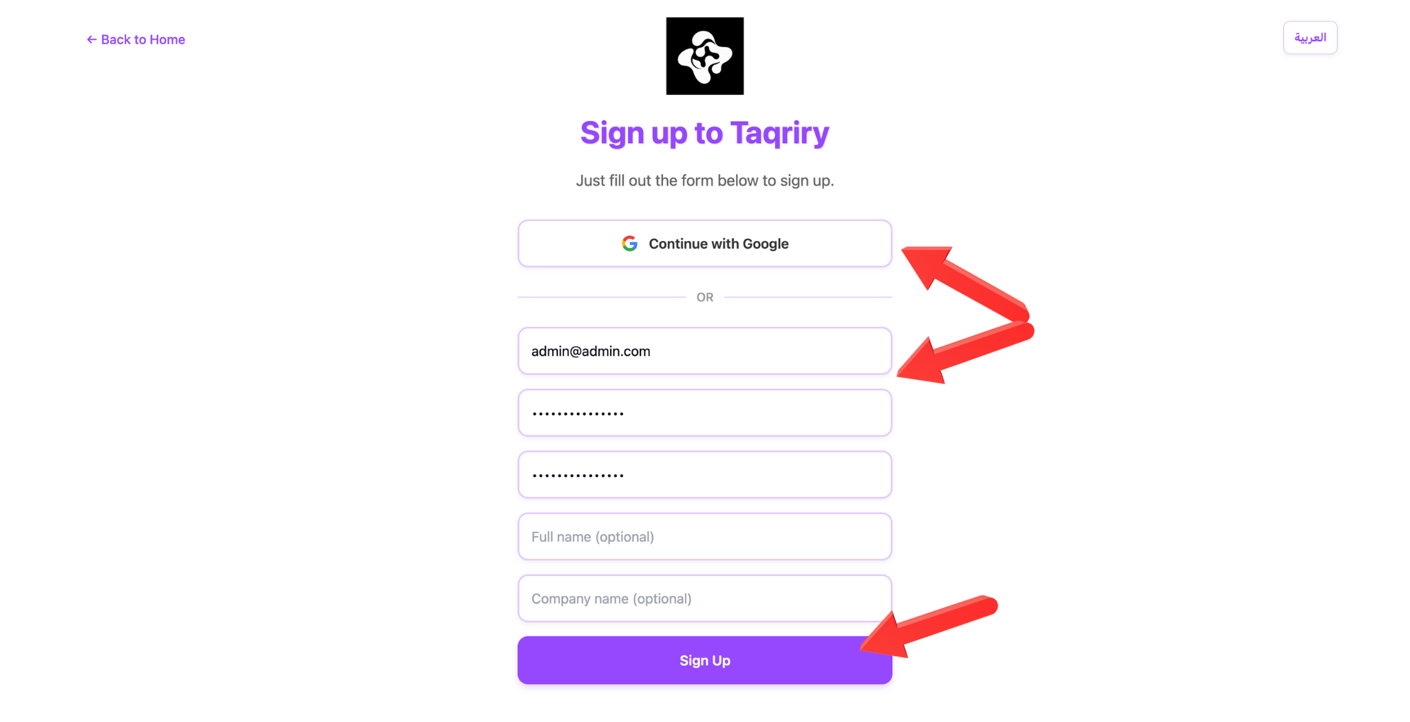 Provide your email address, create a secure password, and enter your full name and organization details.